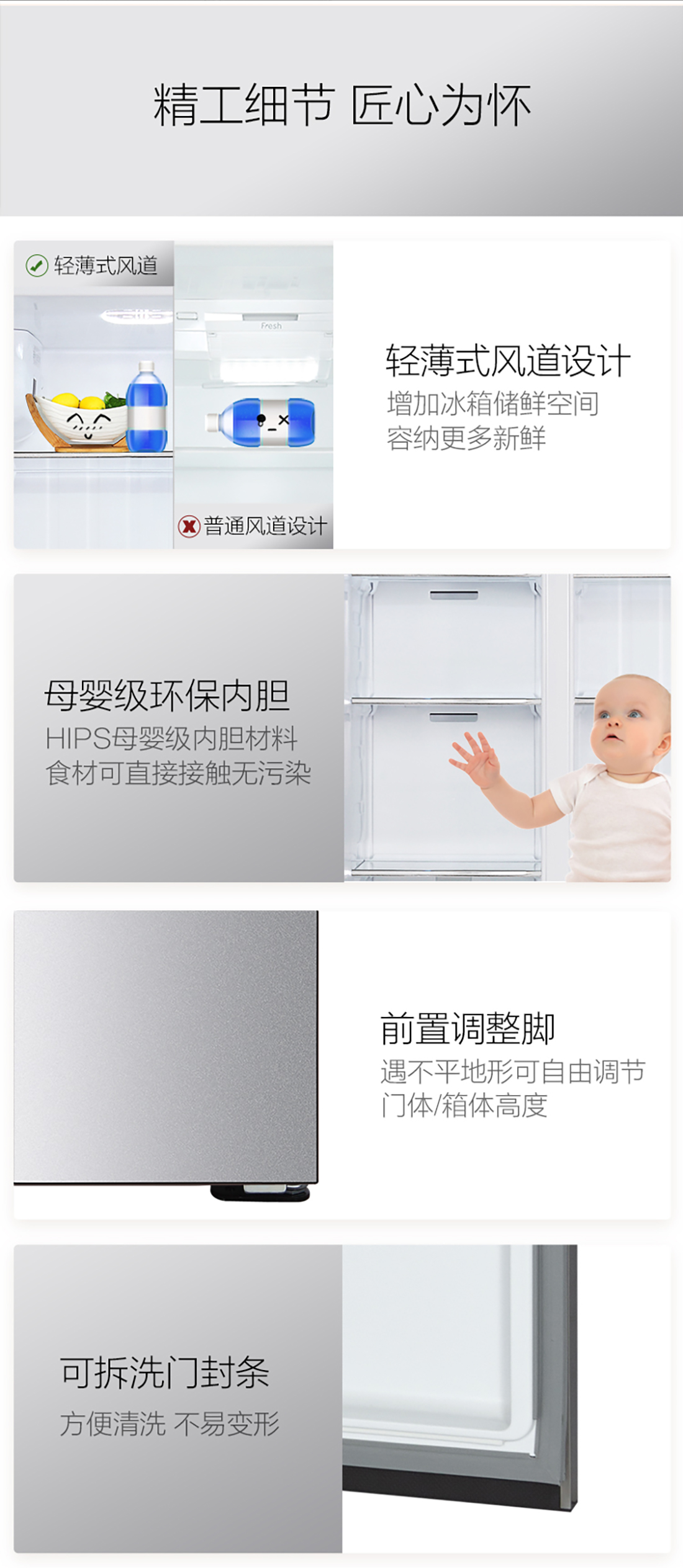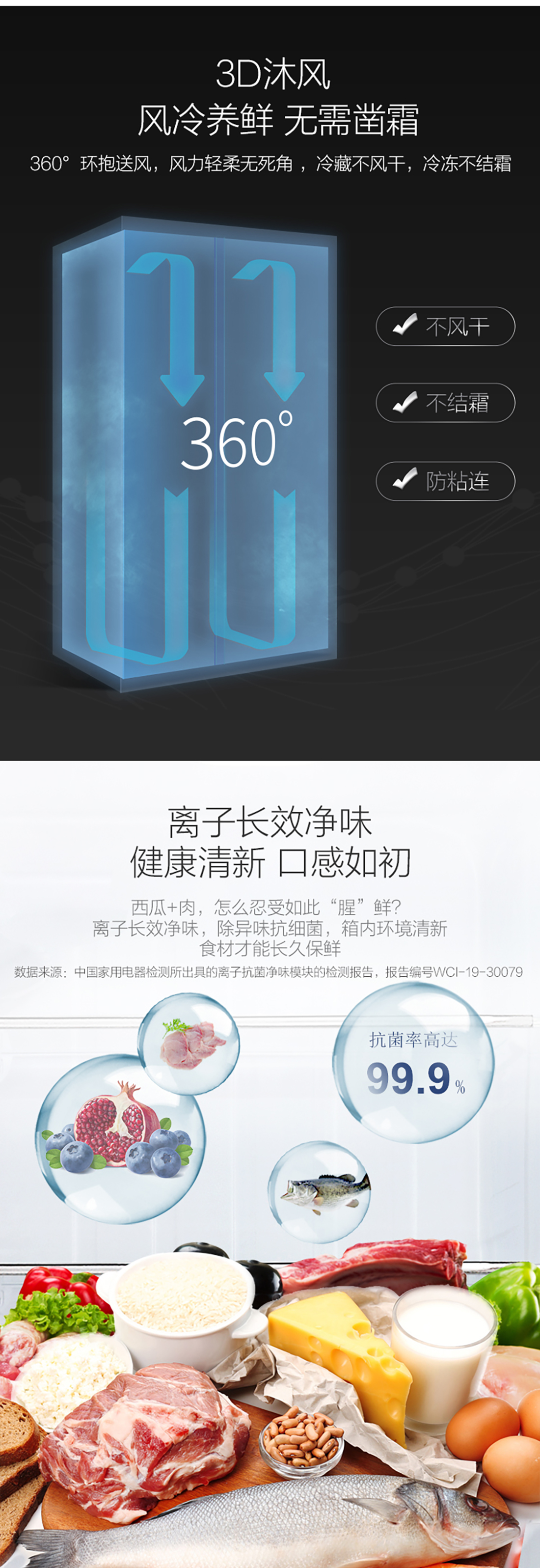 搭載-33℃深凍鎖鮮科技,肉汁飽滿更長久。采用離子長效抗菌凈味,抗菌率高達99.9%。3D沐風,風冷養鮮,無需鑿霜。